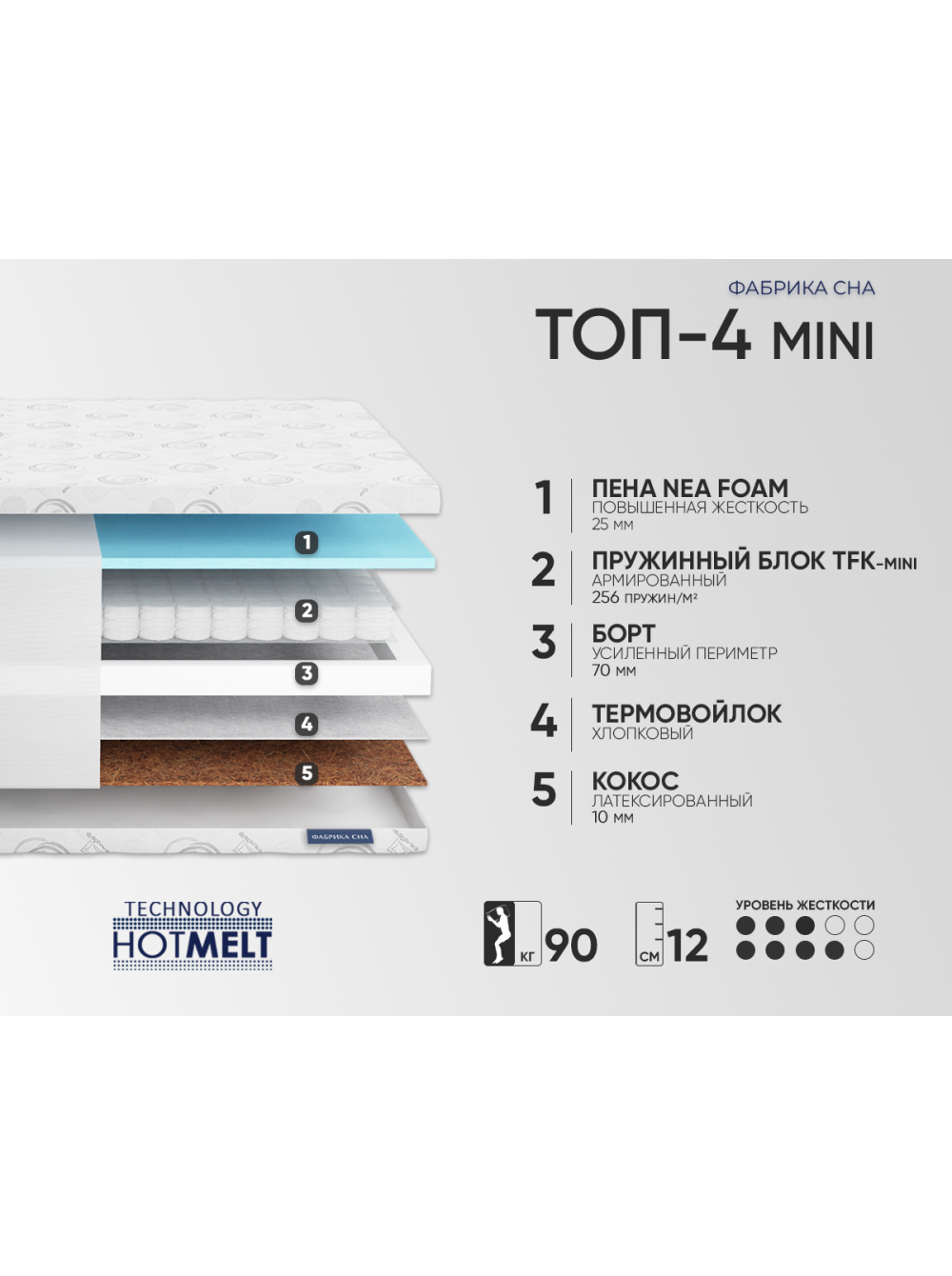 Система жесткого периметра матраса выполнена из пены высокой плотности толщиной 70 мм. Располагается внутри матраса, создает идеальную форму его боковой части и дополнительно повышает жесткость краев, защищая их от проседания при нагрузках.